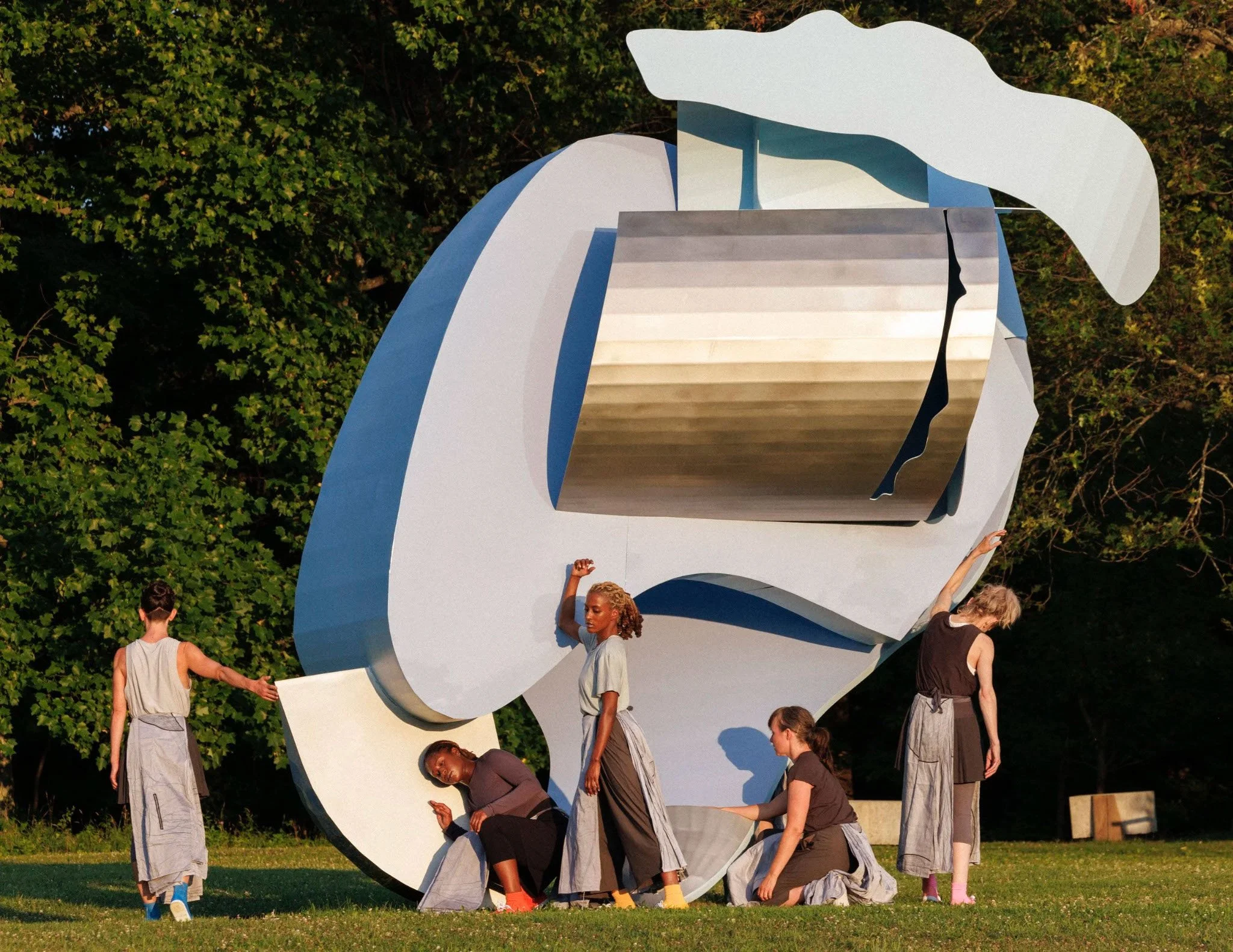 Dancing around and on Shechet’s marvelous, giant Girl Group sculptures (2023 – 2024, approximately 20’ high by 30’ wide), situated on the hilly 500-acre landscape, six excellent women (girl?) dancers complement the personality of each of the six metal sculptures, their movement enhancing the sculptures’ gentle curves and openings, and stand-firm formidability. The overcast afternoon did not diminish the potent conversation among dancer, sculpture, and theatrical landscape. Weather, too, is part of the setting.