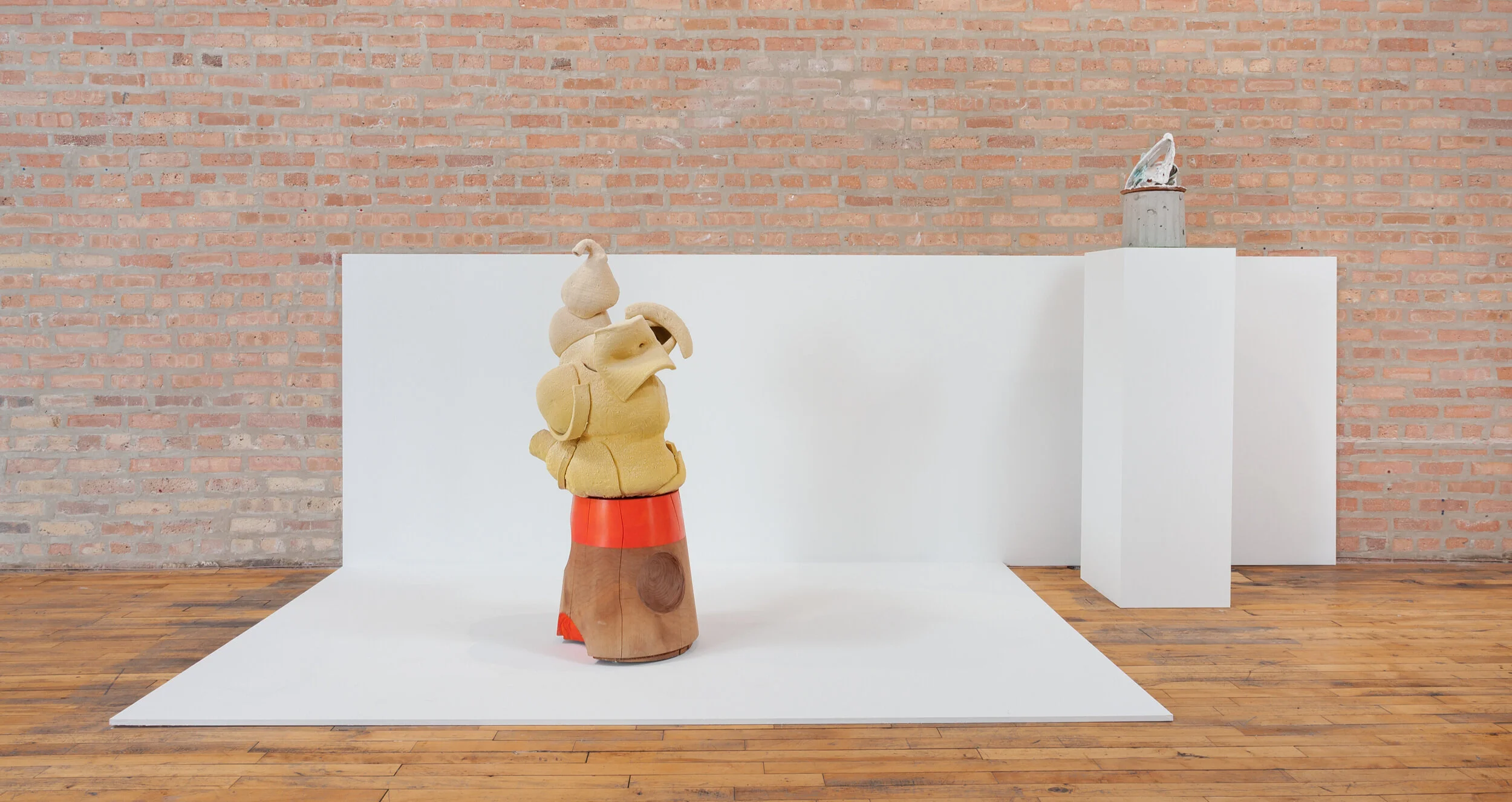 Installation view of Equal Time, 2017. Glazed ceramic, painted hardwood, steel. 53 x 35 x 23 in.