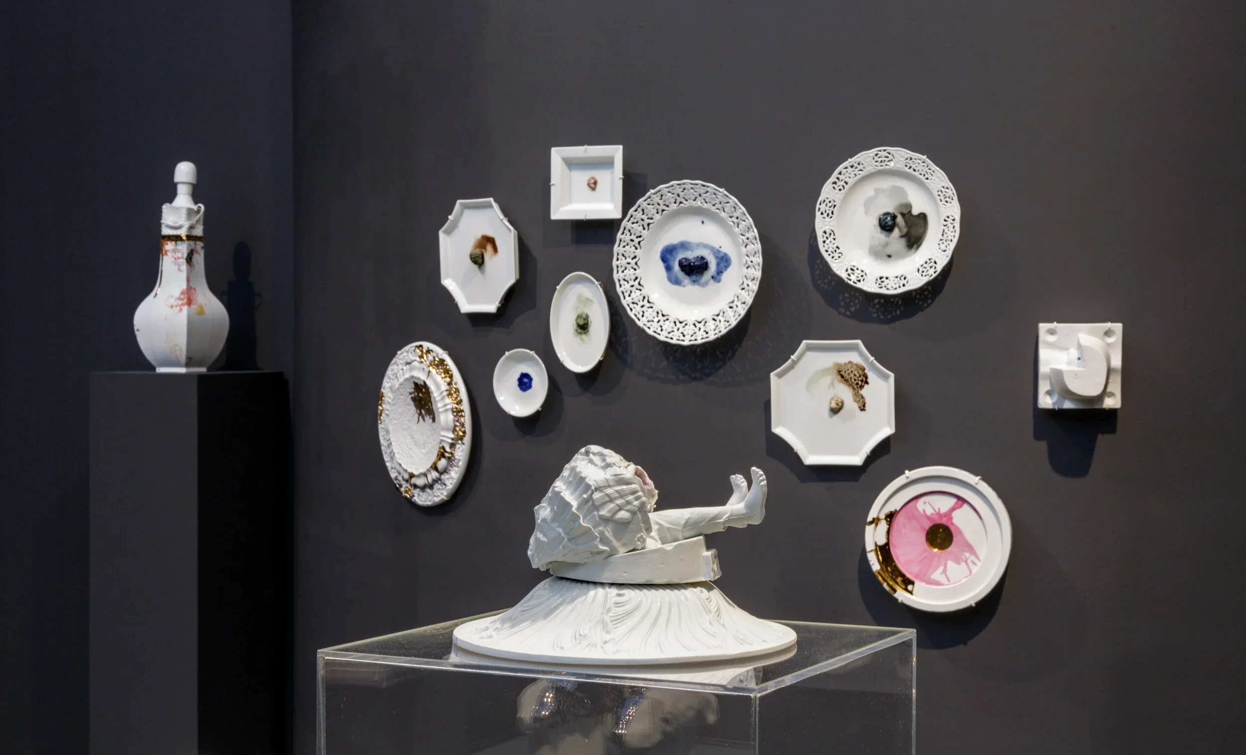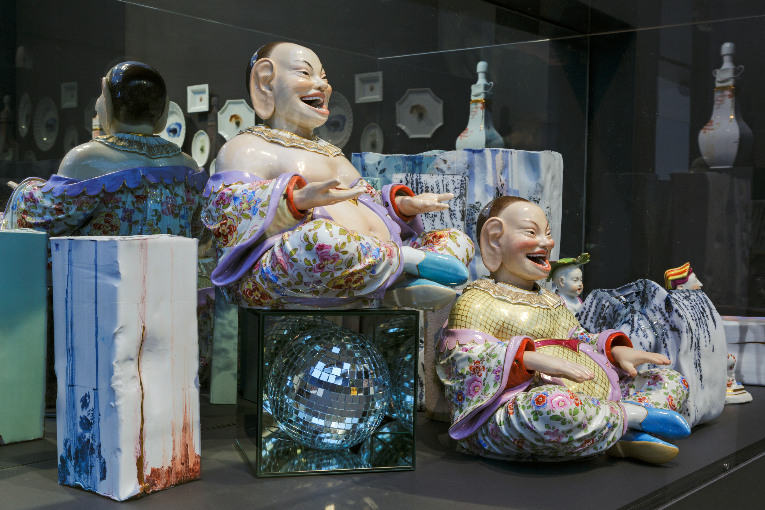 Best Behavior, 2014-2015. Glazed ceramic, glazed kiln shelf, painted and carved hardwood. 45.5 x 20 x 20 inches.
