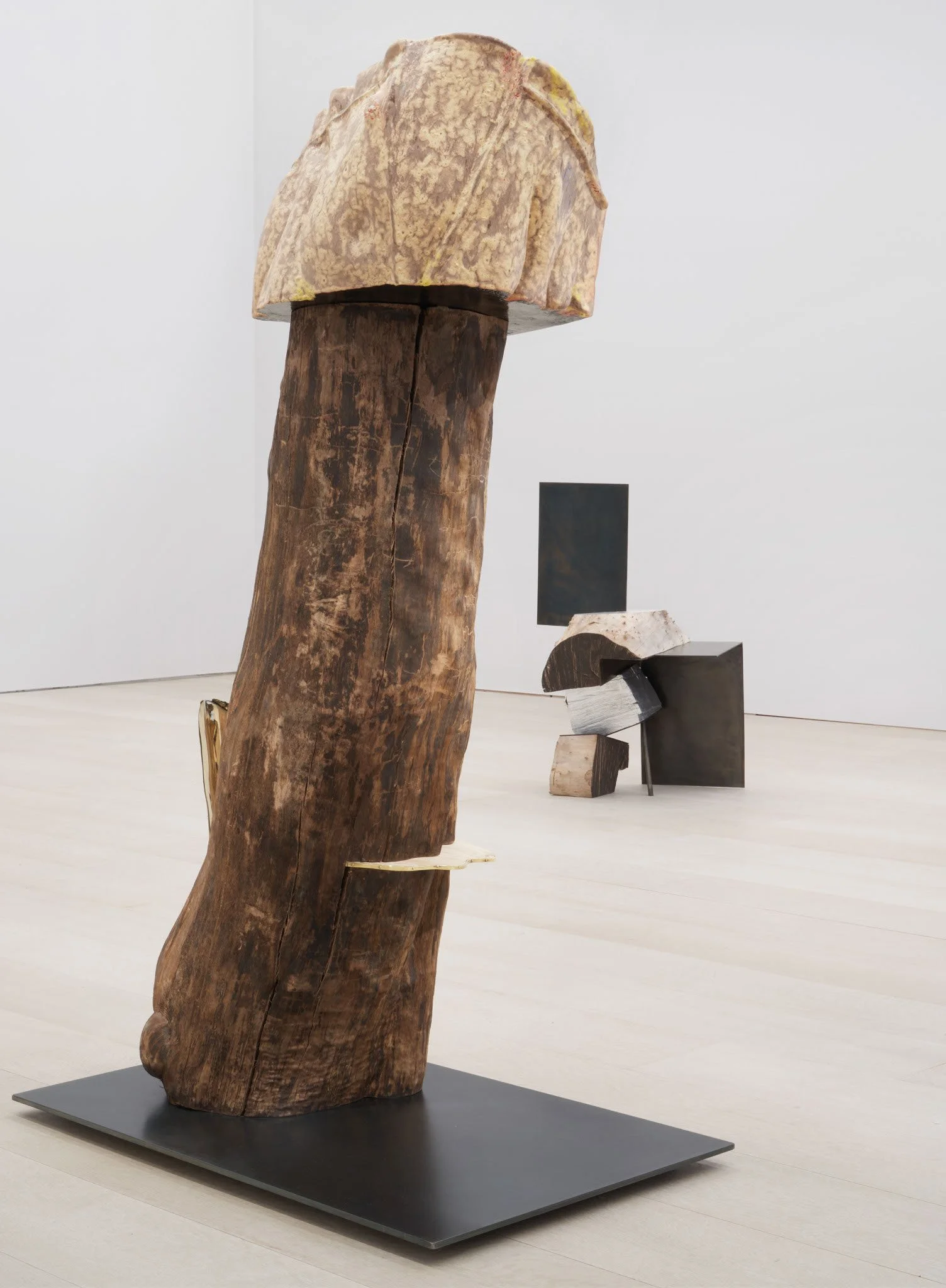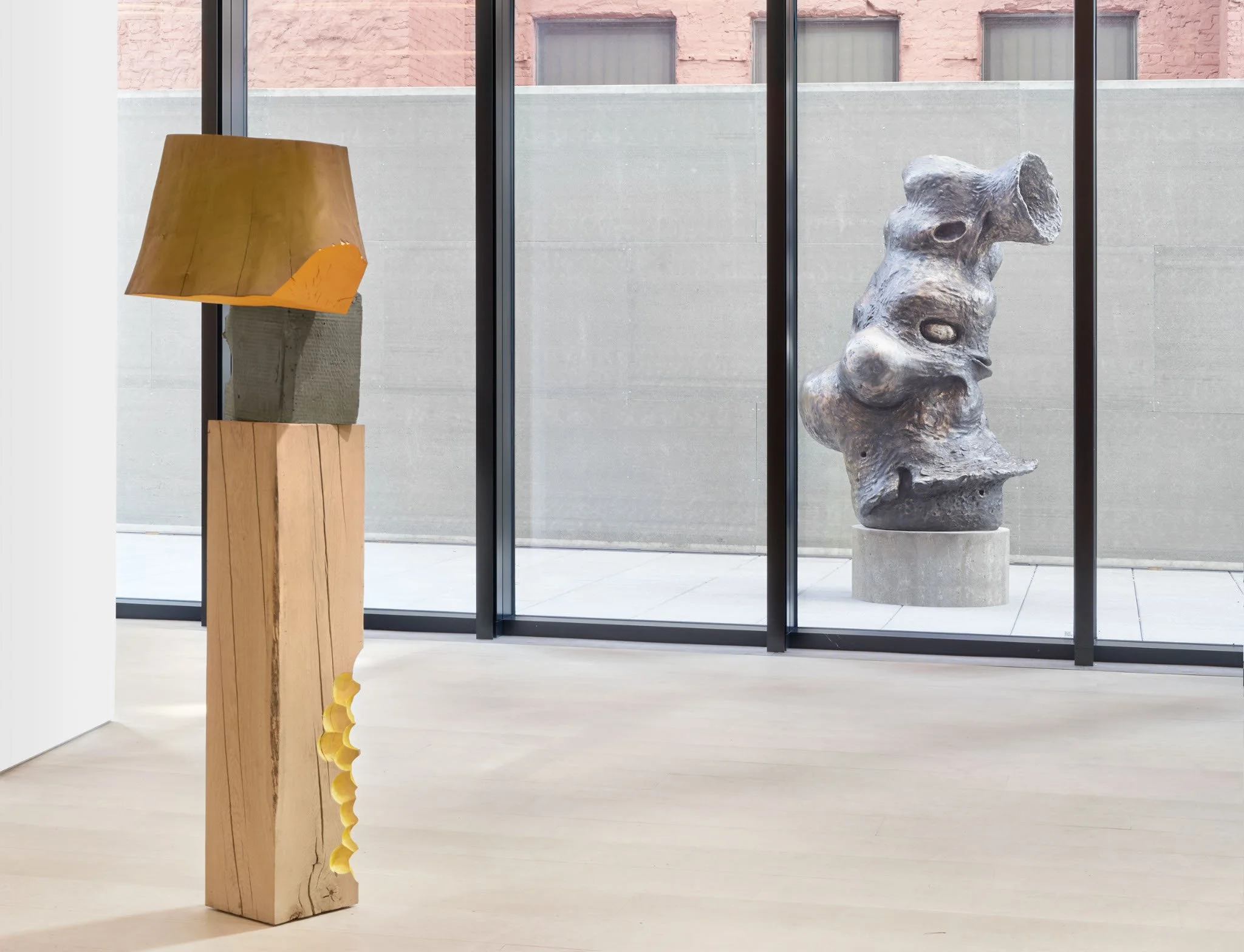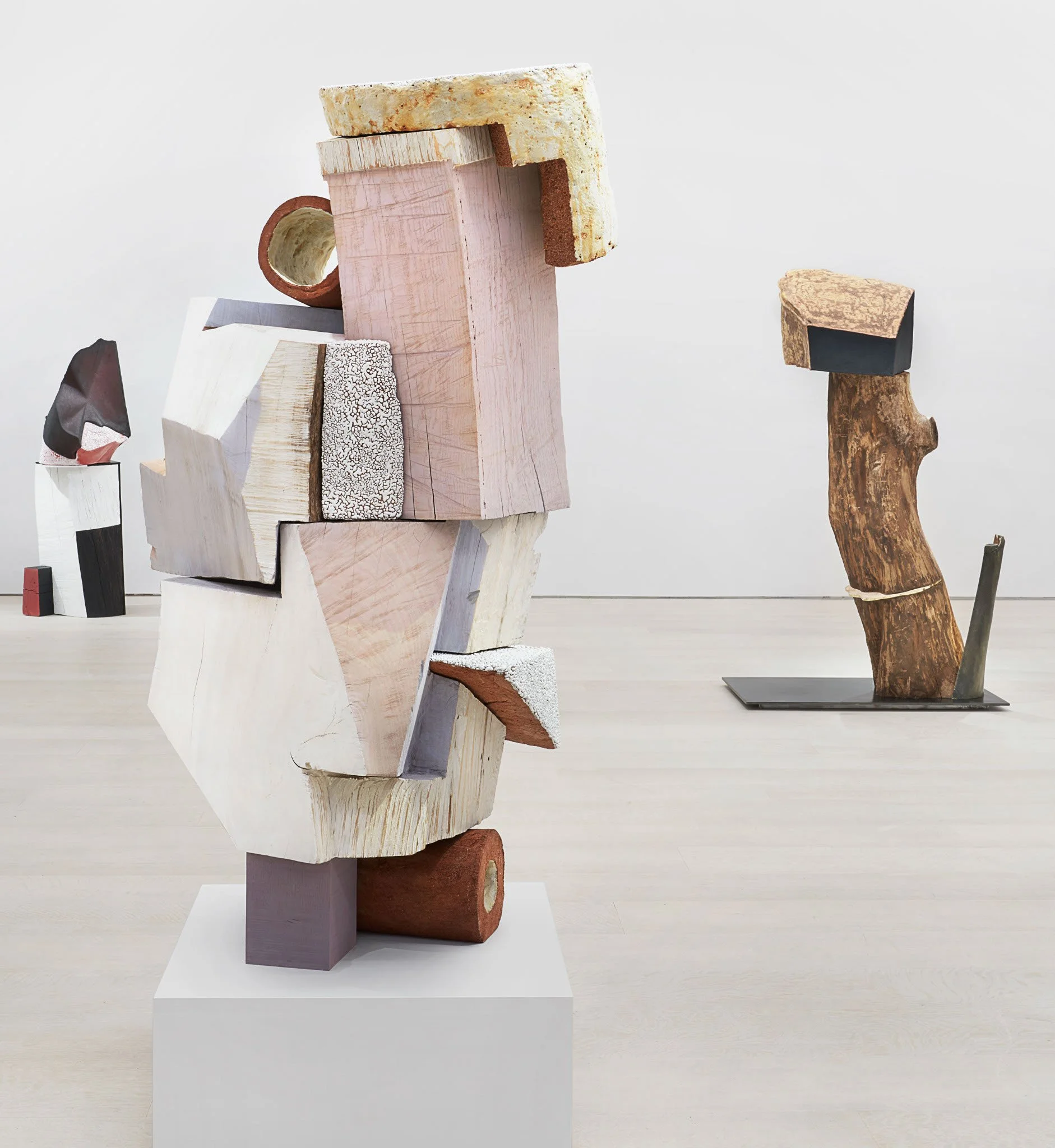 Utilizing a title that is both a noun and a verb, Skirts is a testament to the artist’s fluid and unformulaic process. Though her works appear effortless and forgiving of imperfections, they are the belabored products of an intuitive and technically fastidious approach, involving casting, painting, firing, carving, stacking, undoing and redoing with no predetermined endpoint. Her expansive approach to sculpture and materials is reminiscent of artists Shechet admires, such as Sophie Taeuber-Arp and Sonia Delaunay, whose work transcends the divisions of painting and sculpture and encompassed innovative multimedia practices, distinguishing their work from that of their male peers. Shechet’s title, Skirts, also reclaims misogynist slang. As if to counter this term’s reduction of women to passive things, Shechet’s unruly, polymorphous sculptures suggest that objects themselves are active and subversive.