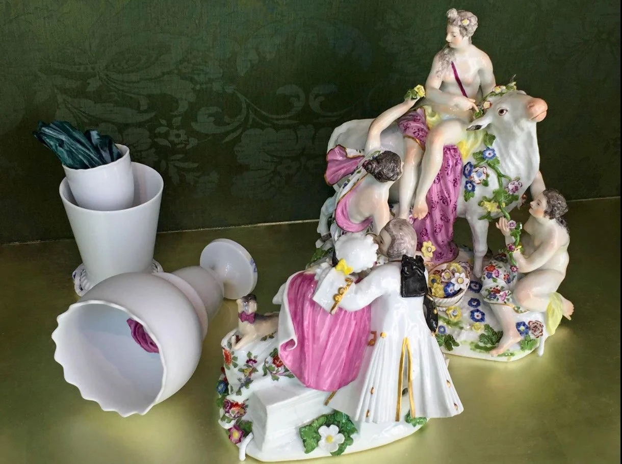 “ Shechet is the first living artist to exhibit in depth at the Frick. Her installation—a balancing act of respectful and radical—pairs early-eighteenth-century Meissen porcelains with sculptures she recently made at the same German factory. It’s a triumph that could have been a disaster, a paragon of Old Master virtue jumping on the make-it-new bandwagon, and the museum’s curator of decorative arts, Charlotte Vignon, deserves major credit for taking the risk. So does the collector Henry H. Arnhold, who gave Shechet free rein of his trove of hand-painted plates, bowls, vases, tea services, and sublimely absurd figurines. What makes Shechet such an inspired choice isn’t simply the twenty months she spent, on and off, in a Meissen studio, working closely with the company’s artisans. It’s her long-term interest in East-West connections. Since the nineteen-eighties, Shechet has made a close, secular study of Buddhist art. At one delightful point in the show, a robin’s-egg-blue-and-white fluted bowl, from 1730, seems to float in midair above an elegantly chunky sculpture, made from the same mold in 2012. The bowl’s form was inspired by a lotus, which, in Buddhist lore, is a reminder that even beauty is rooted in mud. It’s a good metaphor for porcelain, too.”
