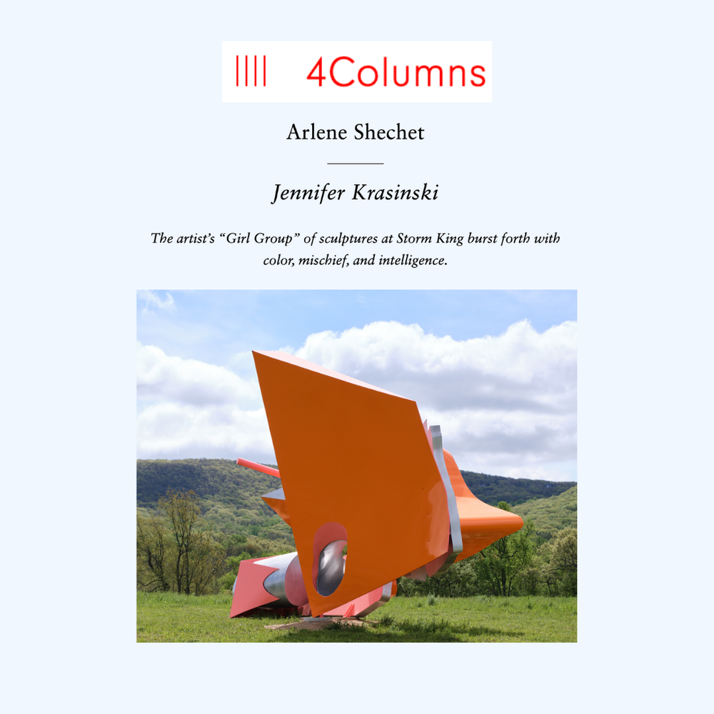 Shechet may be pointed, but she is also generous, her thought-lines extending outward, embracing the context of her peers (whether the peers would appreciate it or not), shifting how we take them all in. The success of pop’s great girl groups has always depended on how they not only reigned as role models but also felt like their fans’ best friends. Where a diva is solo, even feral, a girl group pledges allegiance to other women, and I couldn’t help but note how comparatively morose the work of the other female sculptors at Storm King could be, which led to a question (to which I haven’t yet arrived at a satisfying answer) about whether (or why) men have traditionally understood public art as feat where women think of it as monument—a “dazzle versus gravitas” differential. It’s funny to see Shechet’s giddy Dawn—a near-pirouette in salmon-pink and pale-lilac— within shouting distance of Louise Nevelson’s City on the High Mountain (1983), a superiorly chic steel assemblage in the artist’s usual, infallible all-black. Also nearby is North South East West (1988/2009/2014–15), a far-out castbronze fountain by Lynda Benglis that looks like a molten coven gathered around a rather demure spout, while acres away Magdalena Abakanowicz’s Sarcophagi in Glass Houses (1989) holds us at a stone’s throw from grief. Tacitly adding these heads to Shechet’s Hydra, Girl Group delivers a potent hit.